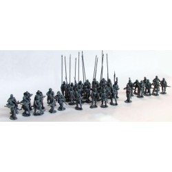 Boites de 40 figurines 28mm en plastique dur, permettant de monter arquebusiers, arbalétriers et piquiers, ainsi que des socles en plastique.